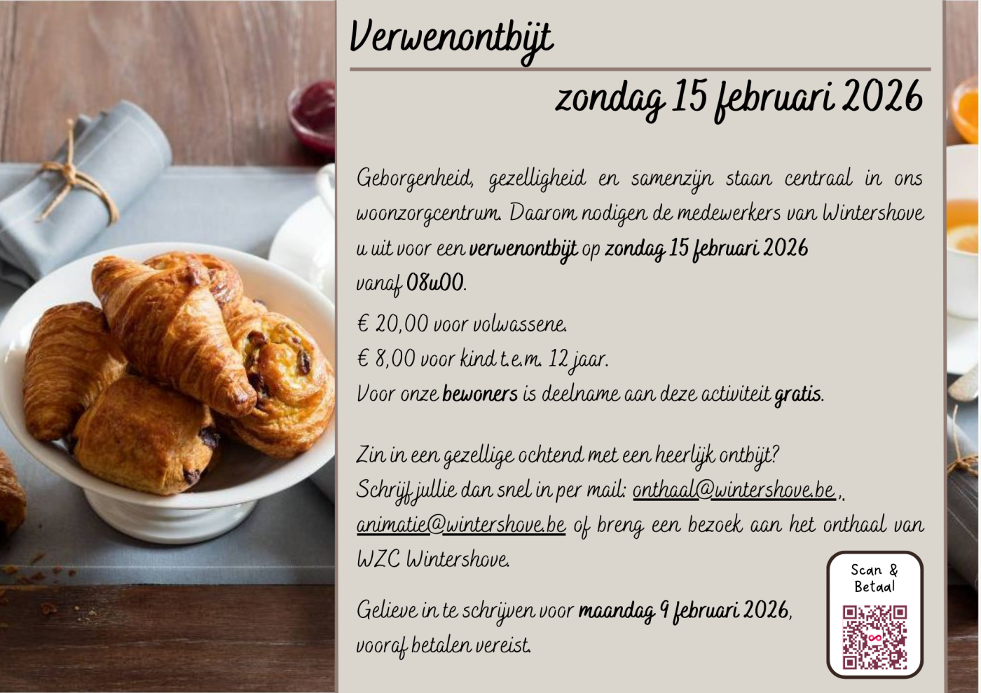 Geborgenheid, gezelligheid en samenzijn staan centraal in ons woonzorgcentrum. Daarom nodigen de medewerkers van Wintershove u uit voor een verwenontbijt op zondag 15 februari 2026 vanaf 08u00.